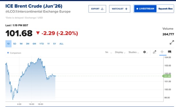 国际油价因此下跌,WTI原油一度失守97美元/桶,日内跌幅4.8%;布伦特原油高位跳水至98.70美元/桶。