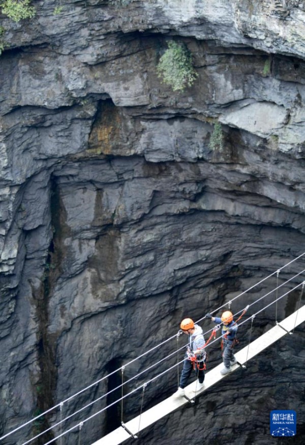 2月17日,游客在湖北省宣恩县锣圈岩天坑上空体验高空行走。