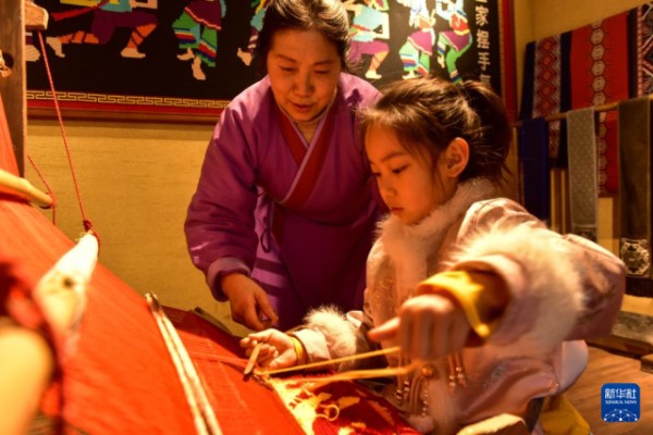 2月16日,小朋友在重庆市酉阳土家族苗族自治县桃花源景区学织土家织锦。