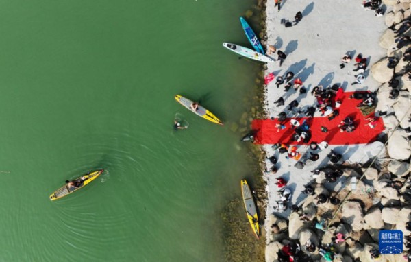2月10日,桨板爱好者在四川省广安市武胜县龙女湖水域练习。