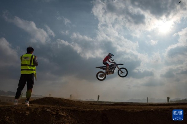 2月16日,在云南省马关县越野摩托车场地上,摩托车手飞越障碍。