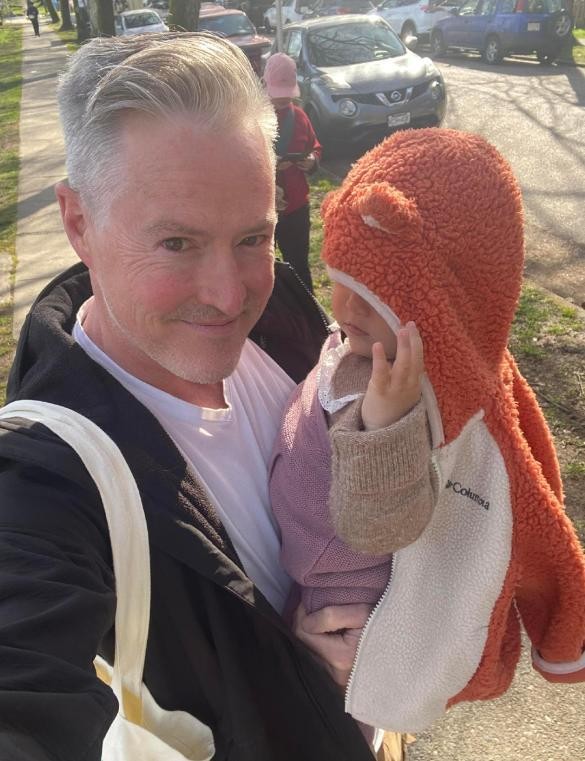 70后夏克立抱娃出街,头发花白、脸上皱纹也多,54岁状态确实显老