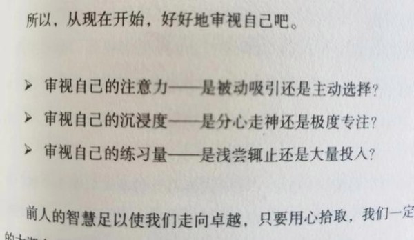也许你会说,你不是也有大量练习吗,为什么写作水平还是这么差,也没有取得什么成绩?是的,我也问了我这个问题,后来我在这本书中找到了答案。《刻意练习》里面说,绝大多数人的努力都属于“天真的练习”,即反复做某件事情,这种只靠重复的“埋头干”和“正确的方法”相去甚远。至于什么是正确的方法,我在这里卖个关子,请各位自己去书中找答案吧。