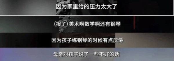 原因是压力太大,父母给他报了一大堆培训班,练琴时感到厌倦被妈妈批评了。