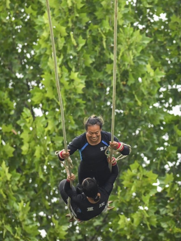 9月10日,重庆队组合麻七斤/王荣正在秋千比赛中。新华社记者胡超摄