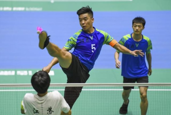 9月10日,河南队毽球选手杨宇(中)在比赛中进攻。 新华社记者彭源摄