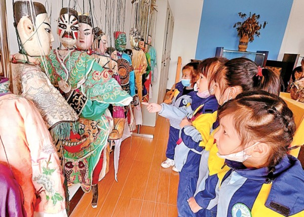 平潭敖东中心幼儿园幼儿在苍海村参观词明戏提线木偶。