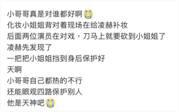当时补妆间隙,有两个正在对戏的演员在旁边排练,眼看就要打到站在张凌赫身后的化妆师了。危急时刻,张凌赫几乎是下意识地伸手,一把将那位化妆师拉到自己身后护住。那一刻,他明明还一脸痛苦,眼神甚至有点放空,但保护他人的本能反应却快如闪电。